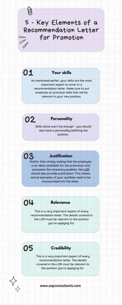 To help you bag the promotion you seek, your recommendation letter for promotion must include certain key elements. These include: